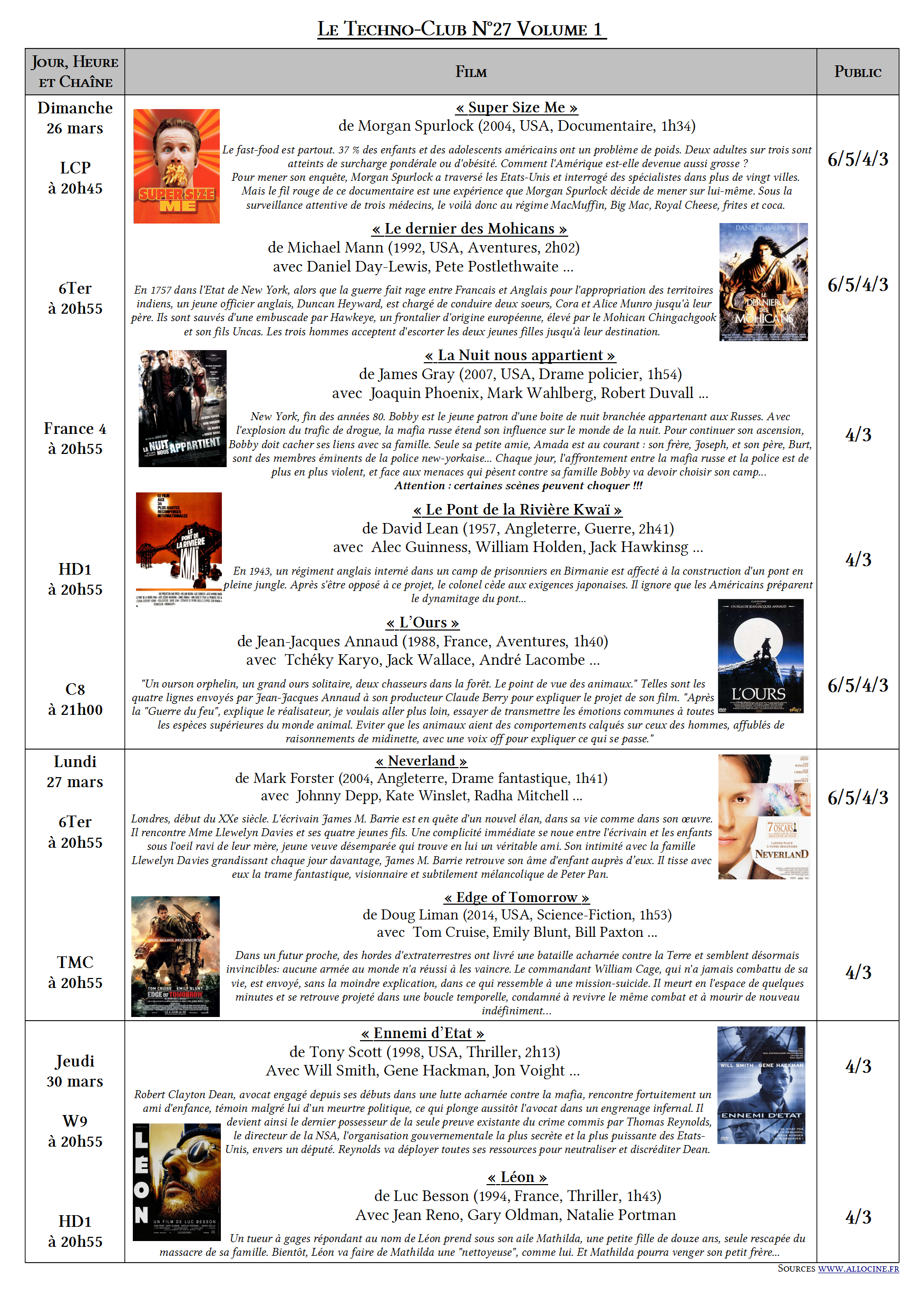 Cela fait déjà deux ans que j’ai instauré un rendez-vous hebdomadaire avec mes élèves (dans mon ancien établissement) à travers une affiche et des flyers les informant des films qui passent sur chaines nationales visibles sur la TNT et que j’ai sélectionnés pour leur intérêt culturel et didactique. Ces propositions de films permettent de prolonger le lien crée avec le 7ème Art lors des projections du dispositif « Collège au Cinéma ». J’essaie, autant que faire se peut, d’orienter les films choisis selon le public 6/5 et 4/3.