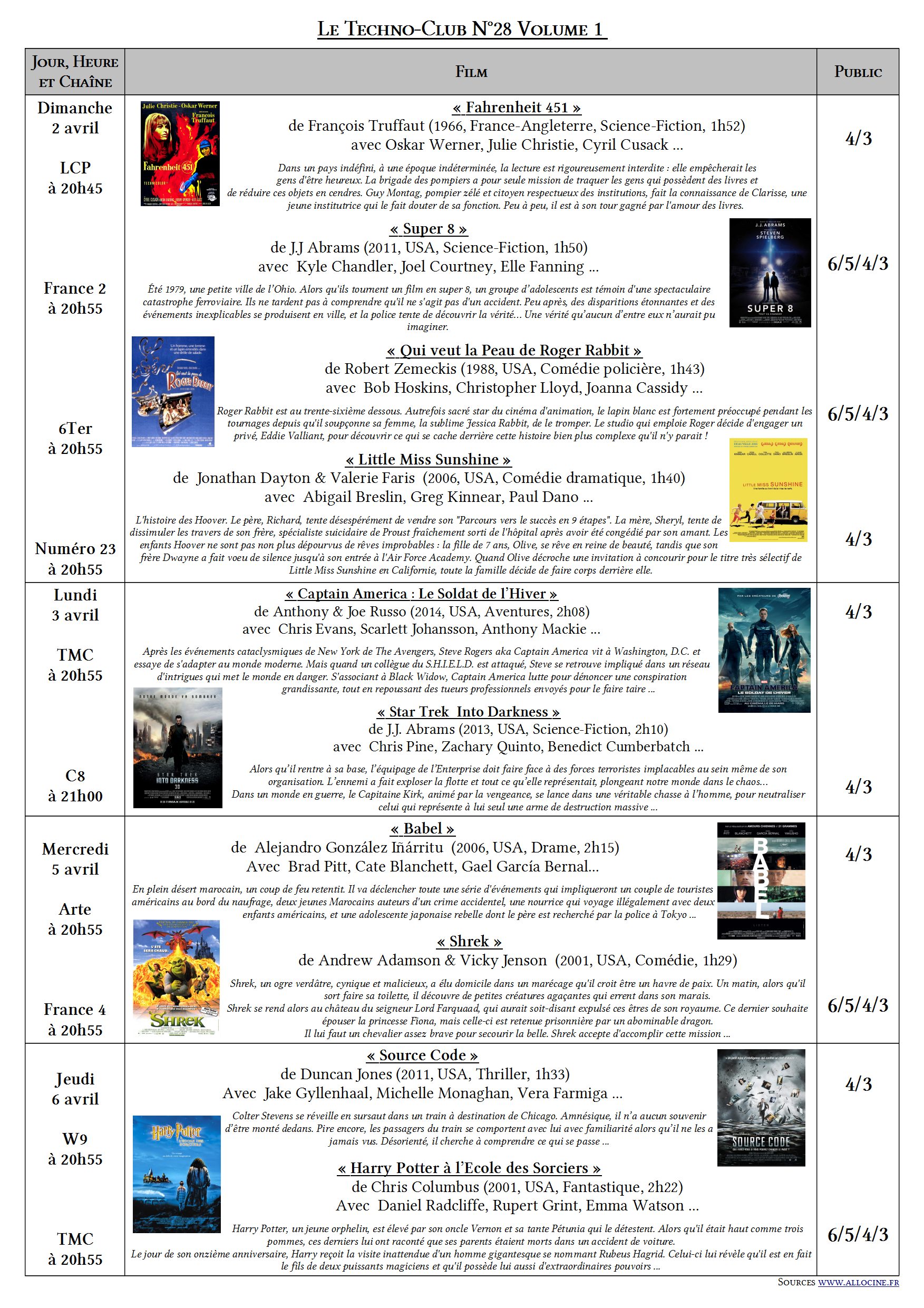 - Lundi soir : Soirée blockbusters des années 2010 avec “Captain America”, 2ème ou bien “Star Trek” 2ème aussi … Des divertissements bourrés de moments de bravoure et d’images de synthèse …