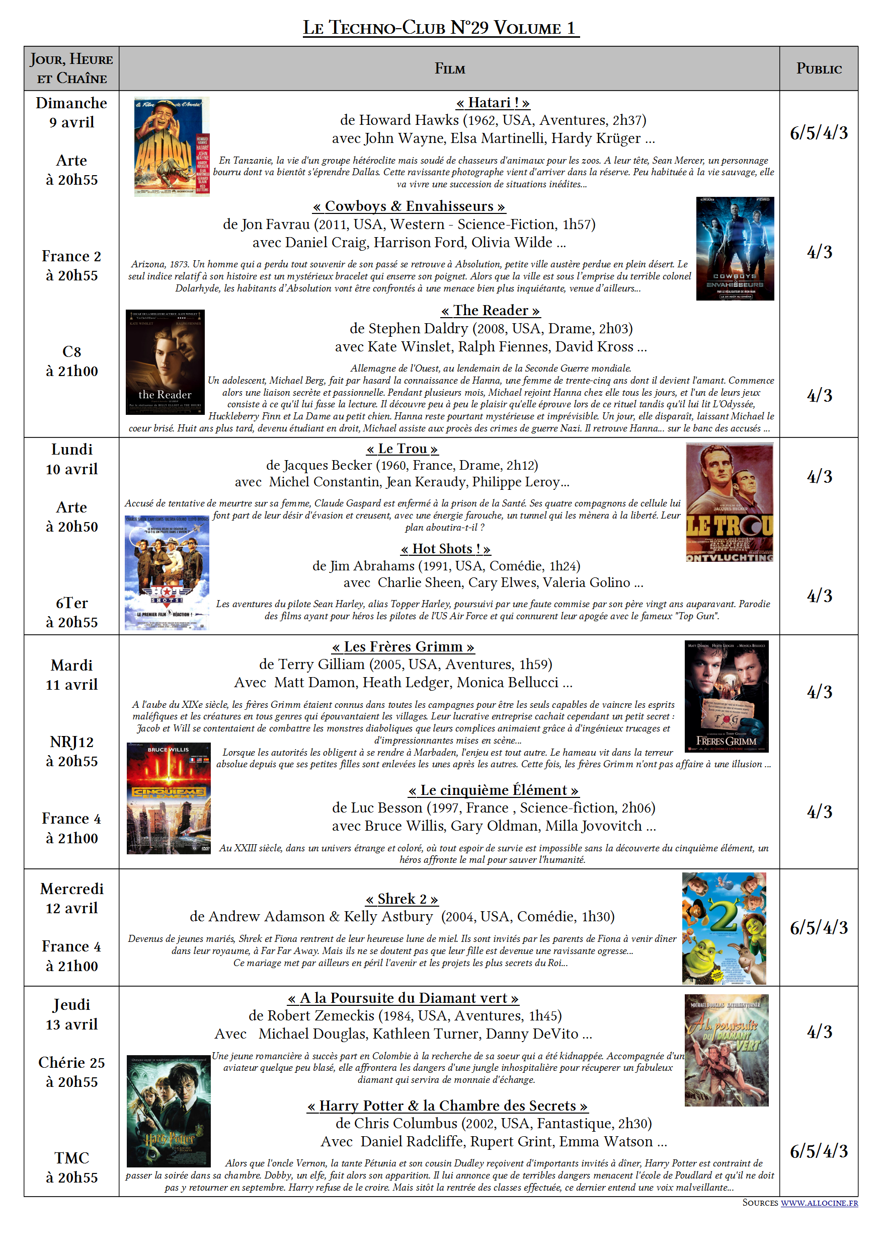Cela fait déjà deux ans que j’ai instauré un rendez-vous hebdomadaire avec mes élèves (dans mon ancien établissement) à travers une affiche et des flyers les informant des films qui passent sur chaines nationales visibles sur la TNT et que j’ai sélectionnés pour leur intérêt culturel et didactique. Ces propositions de films permettent de prolonger le lien crée avec le 7ème Art lors des projections du dispositif « Collège au Cinéma ». J’essaie, autant que faire se peut, d’orienter les films choisis selon le public 6/5 et 4/3.